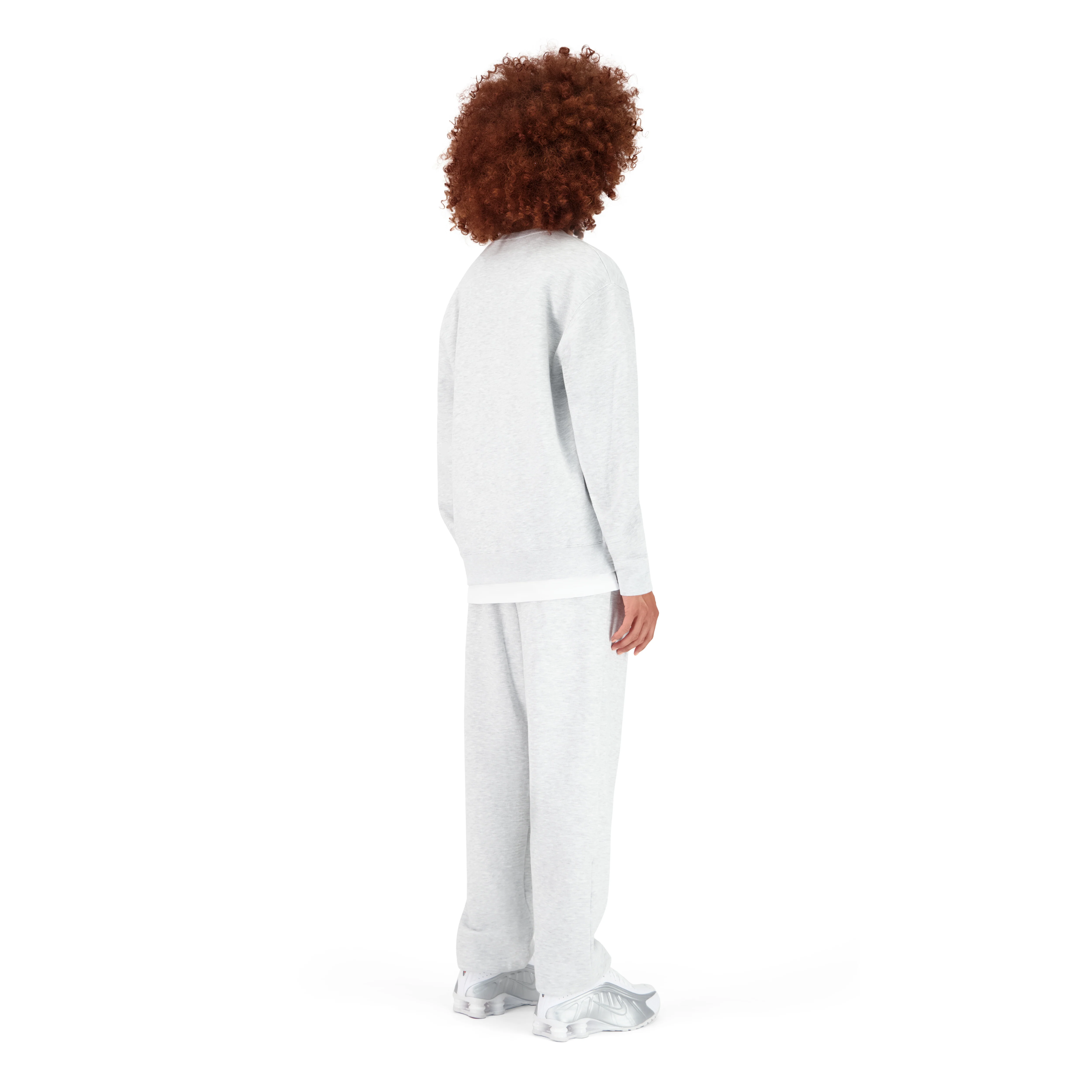 LA MANNEQUIN MESURE 180CM, ELLE PORTE LE CREWNECK EN TAILLE M ET LE PANTALON DE JOGGING EN TAILLE L POUR UN EFFET OVERSIZE.