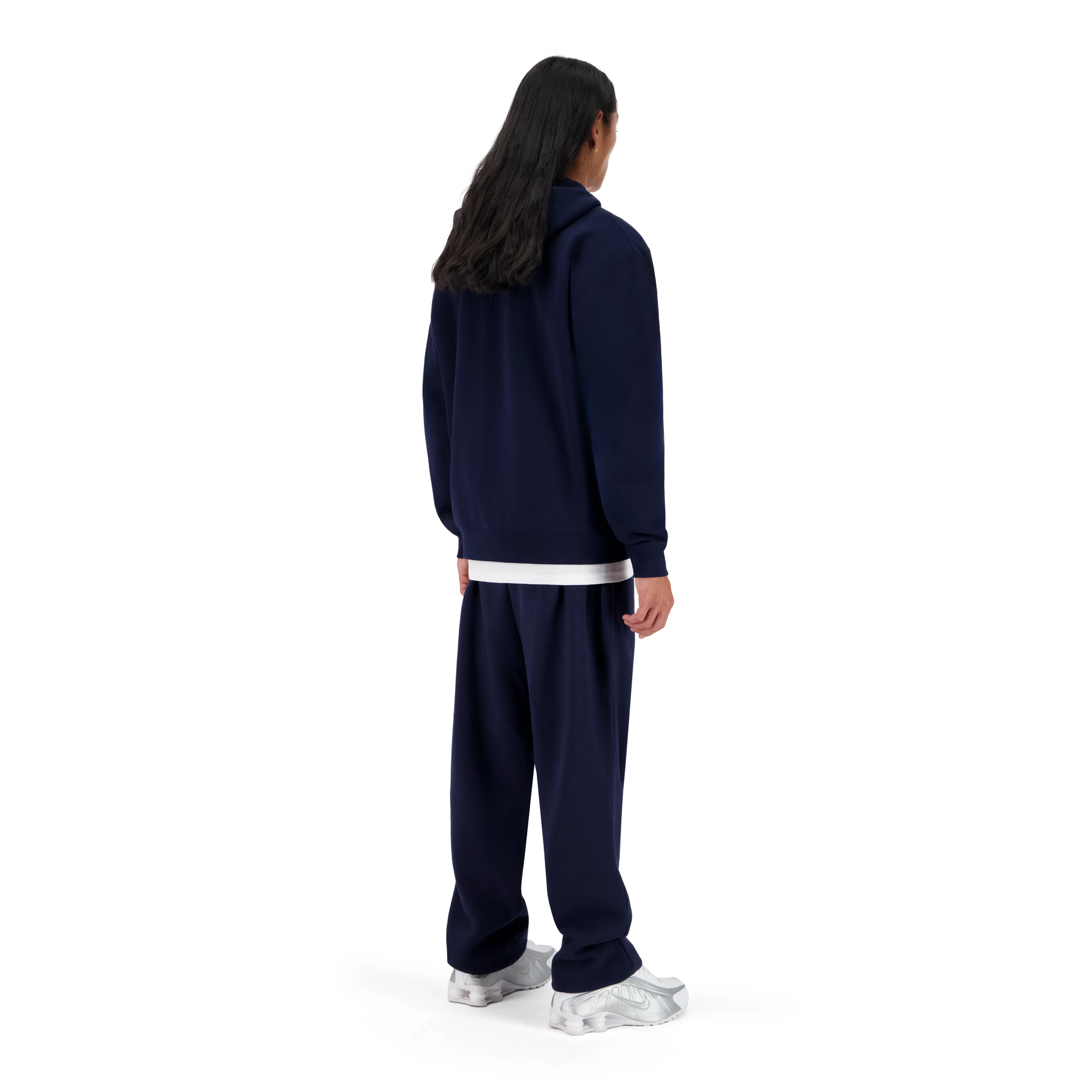 LE MANNEQUIN MESURE 182CM, IL PORTE LE HOODIE ZIPPÉ EN TAILLE L ET LE PANTALON DE JOGGING EN TAILLE XL POUR UN EFFET OVERSIZE.