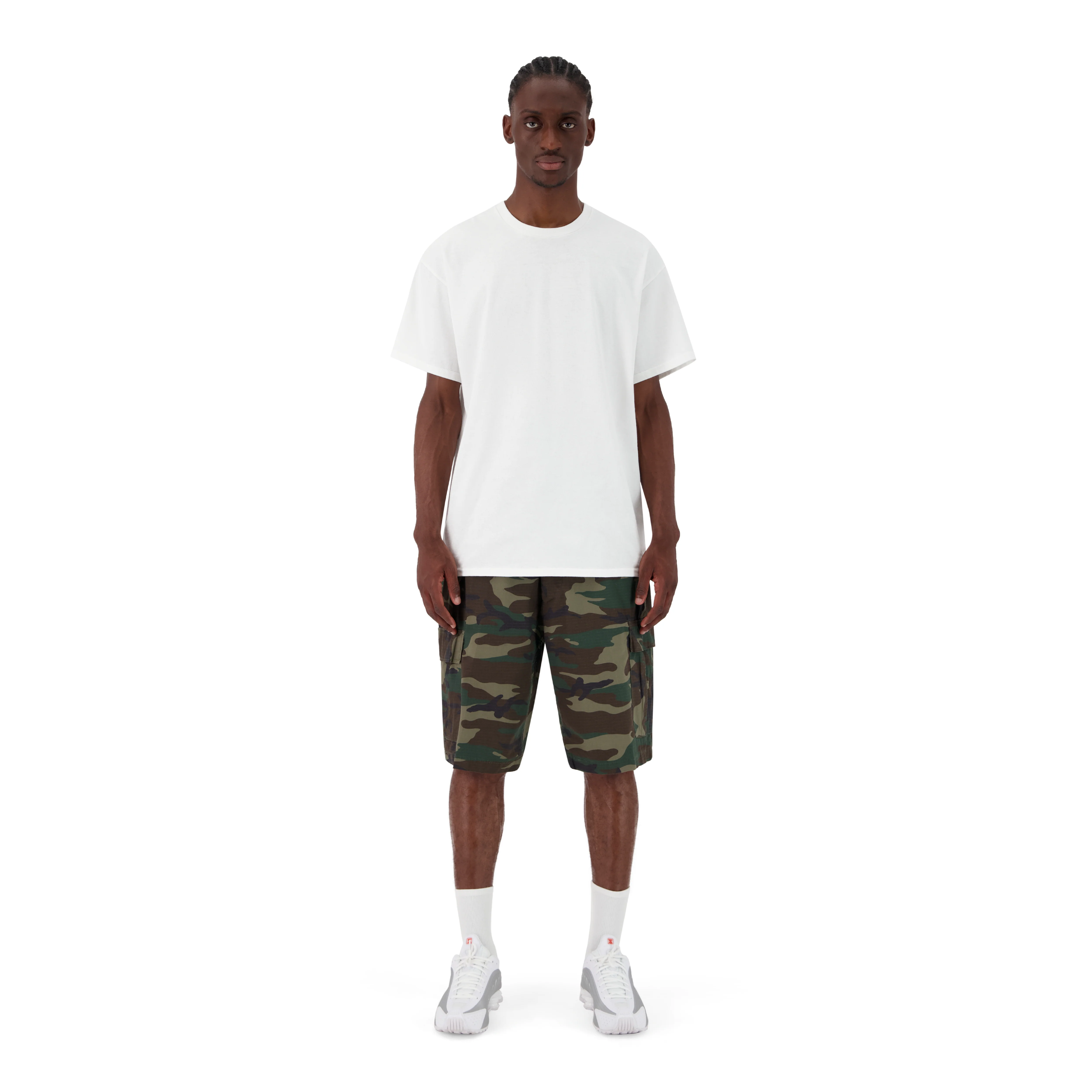 LE MANNEQUIN MESURE 193CM, IL PORTE LE SHORT EN TAILLE 2XL POUR UN EFFET OVERSIZE.